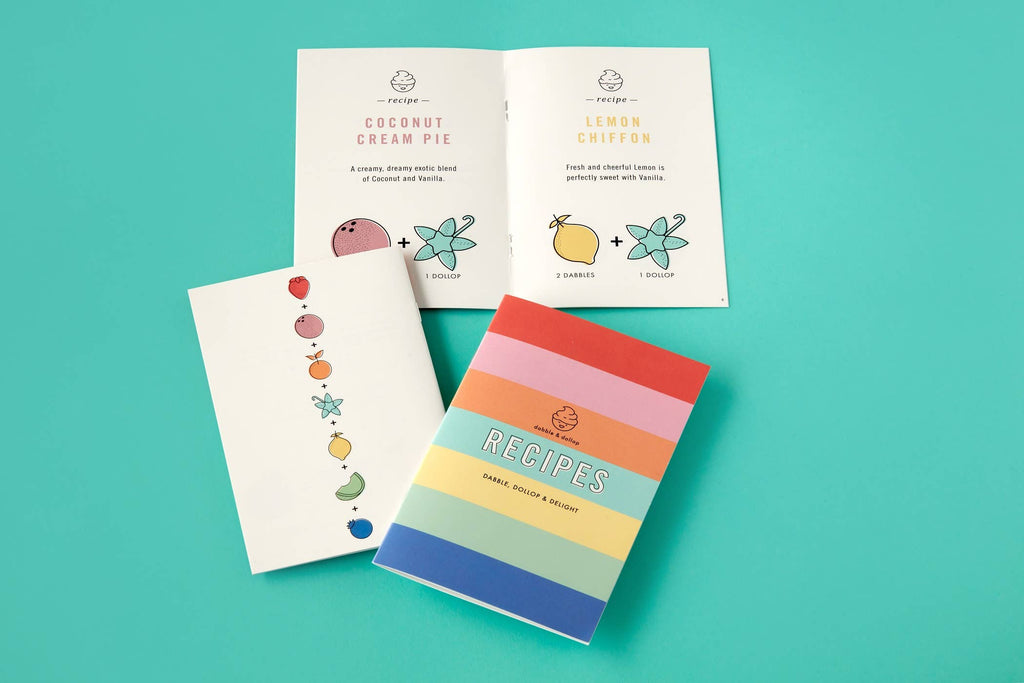 Dabble, Dollop, & Delight with our NEW Recipe Booklet! This 12-page keepsake features 11 easy to follow recipes teaching littles how to make bubbly combinations like: Strawberry Shortcake, Coconut Cream Pie, Lemon Chiffon, and many more! Plus, our last page features six "Create Your Own" spaces where kids can dream up and write down their own combinations! Share a photo of your favorite concoctions with us @dabbleanddollop and we might feature your custom creation in our next Recipe Booklet!