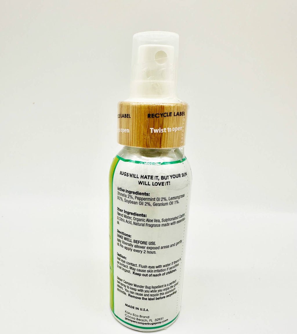 Glamper Camper Wonder Bug Repellent is a perfect travel spray to keep with you while enjoying the great outdoors. You can carry with you anywhere because it comes in a travel size reusable zero waste aluminum bottle.