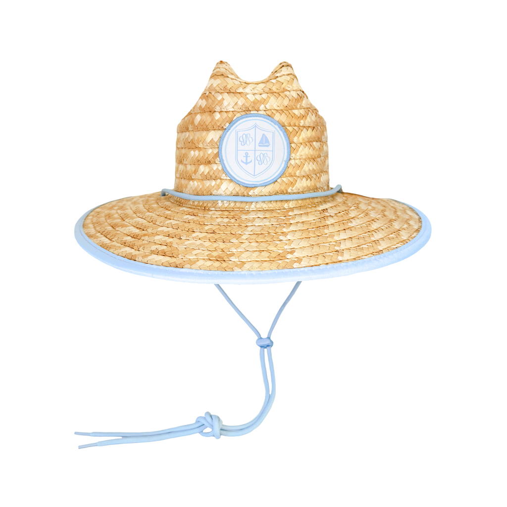 It was only a matter of time before the Lifeguard Hat got the playfully polished Bits & Bows twist! From days at the beach to boating on the bay or lake, this hat features a flattering, sun-protecting shape, breathable straw construction, adjustable chin strap, and a decorative patch inscribed with a coastal anchor, sailboat, and logo crest. • Features a cattleman's crown, wide down-sloped brim, and adjustable blue toggle chin cord & cord-stopper • Blue and white striped fabric on bottom of brim, solid blue trim • Woven of wheat straw in the perfect sandy shade • Fits on average children ages 3-8 years old (54cm circumference)