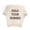 Hold your horses PARDNER, the sheriff is in town! This playful print is matched perfectly to our comfortable natural colored sweatshirt. The screen print is durable and can withstand the hard play that we know your little sheriff loves!