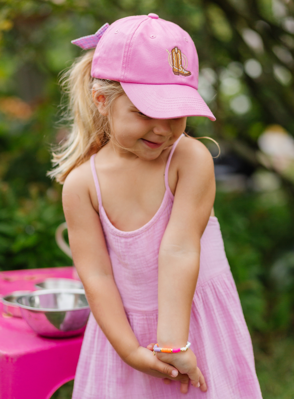 For the little girl who’s never too far from her favorite pair of cowgirl boots, we introduce a fresh-for-Fall accessory to top off her western-inspired style. She’ll be pretty-in-hot-pink and sun-protected, with a fun, feminine bow on the back to elevate her ready-to-rodeo everyday look.