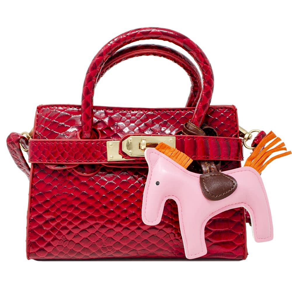 Elevate your child's style with our kids crocodile pony handbag featuring a chic crocodile textured print. This adorable accessory comes with a top handle and matching shoulder strap, providing versatile carrying options. The magnetic closure ensures easy access and security, while the stylish buckle on the front adds a touch of flair. Complete with a charming leather pony charm, this handbag is perfect for your little trendsetter's everyday adventures.
