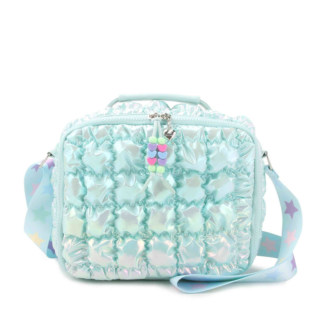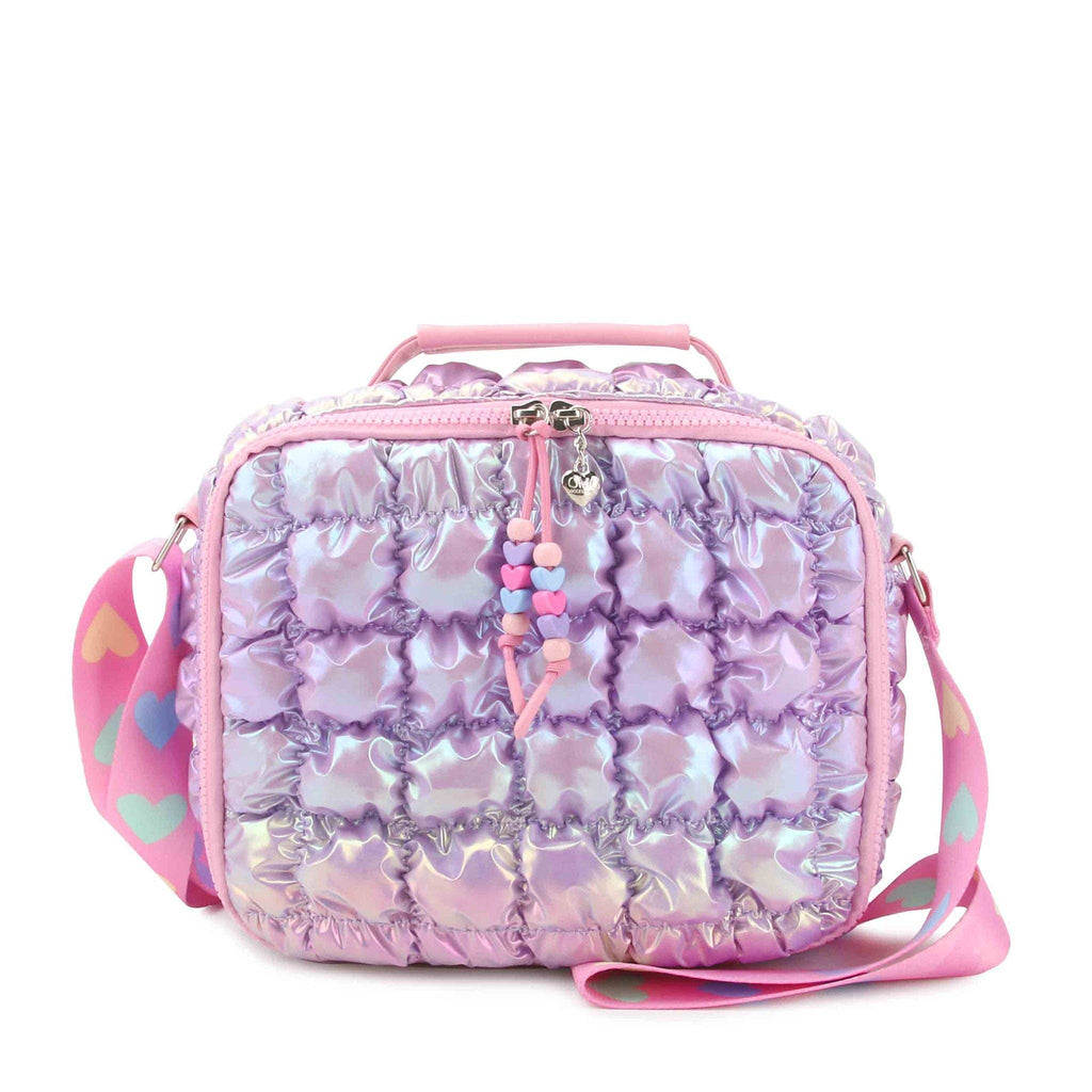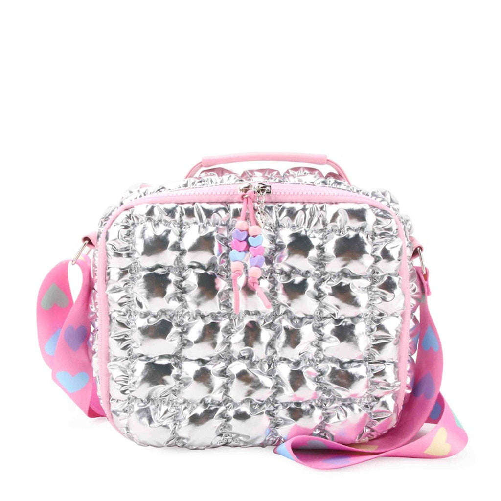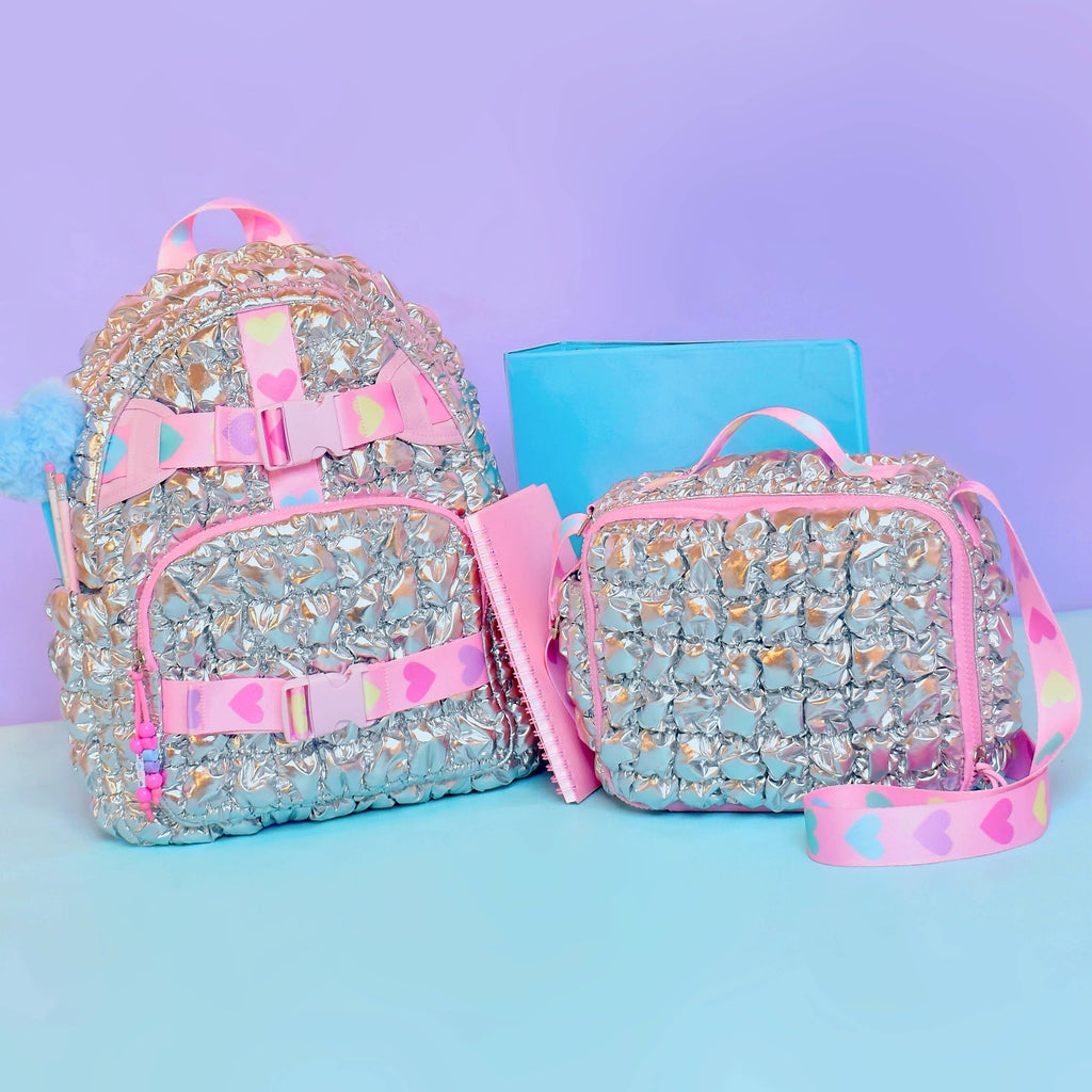 Scrunched to perfection, our new nylon quilted & insulated lunch bags are here to carry all their snacks & meals! This super styling lunch caddy features a silver metallic exterior, beaded zipper pulls, & a heart printed adjustable shoulder strap for easy carrying!