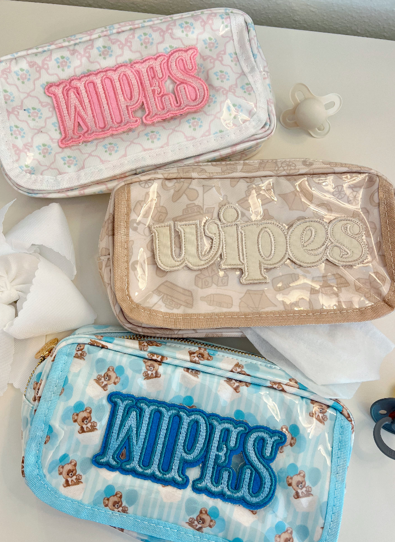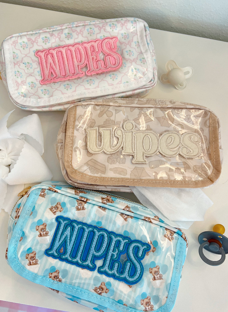 Wipes pouch, this is always a best seller for us! This cute new arrival, available in 3 colorways, is the perfect addition to your diaper bag for all my mamas! Pair it with our matching diapers xl pouch, mama or baby bags, or customizable clear coat bag! Patches sewn on, clear coat exterior makes for easy cleaning! Adjustable flap on top to pull the wipe out of! Ships immediately! Dimensions: 8.5”H x 4.5”W x 2”D Capacity: Fits up to 80 count wipe packs