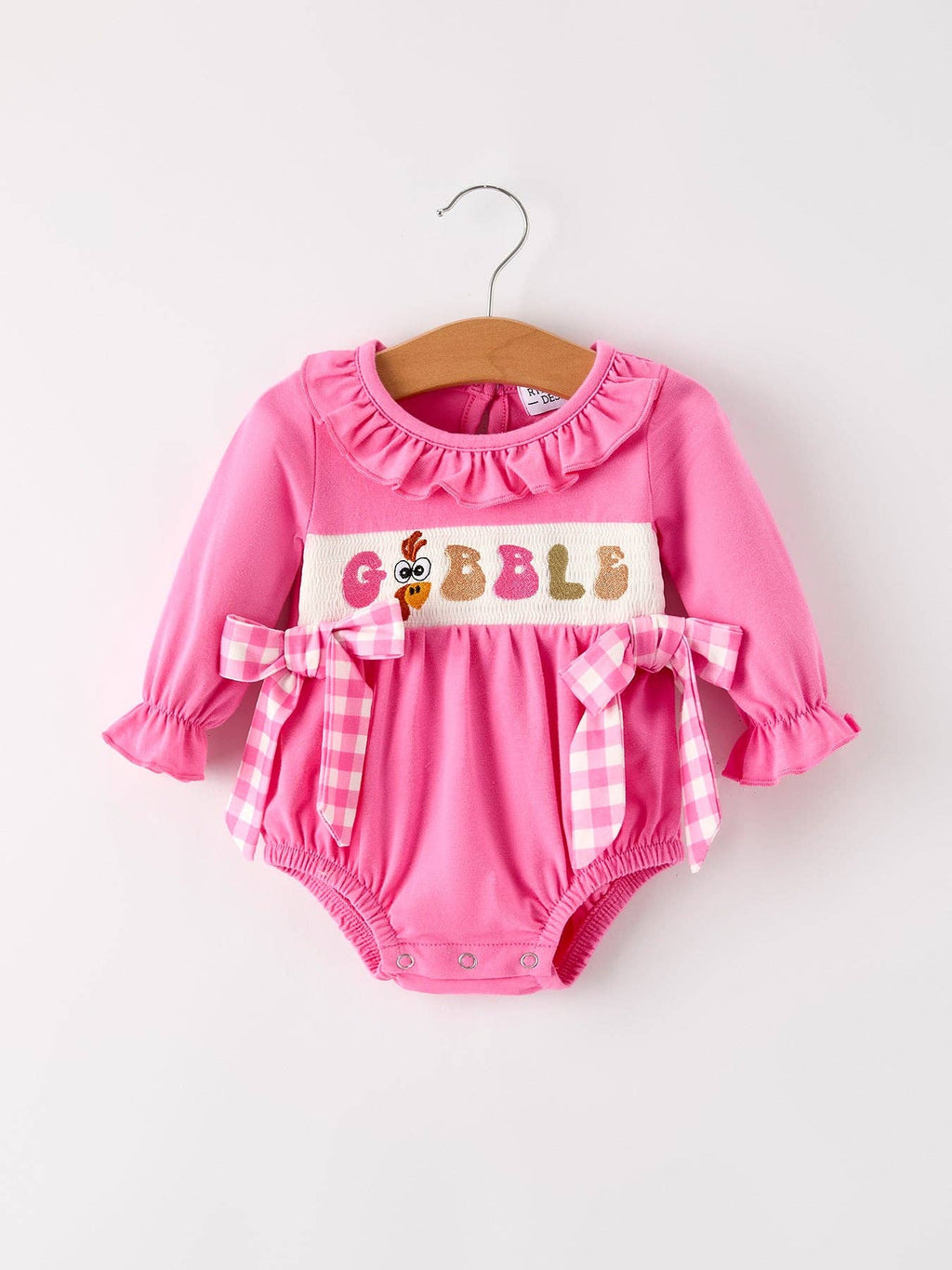 Celebrate Halloween in adorable style with this "GOBBLE" smock embroidery baby girl romper. Crafted for comfort and cuteness, it features charming smock embroidery that adds a festive touch perfect for your little one’s seasonal wardrobe. Soft, breathable fabric ensures all-day comfort, making it ideal for playtime or festive gatherings. Dress your baby girl in this delightful romper to create memorable moments filled with warmth and holiday cheer.