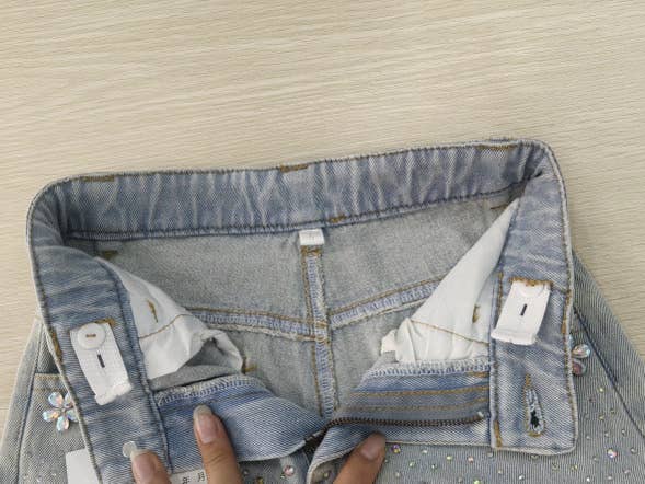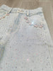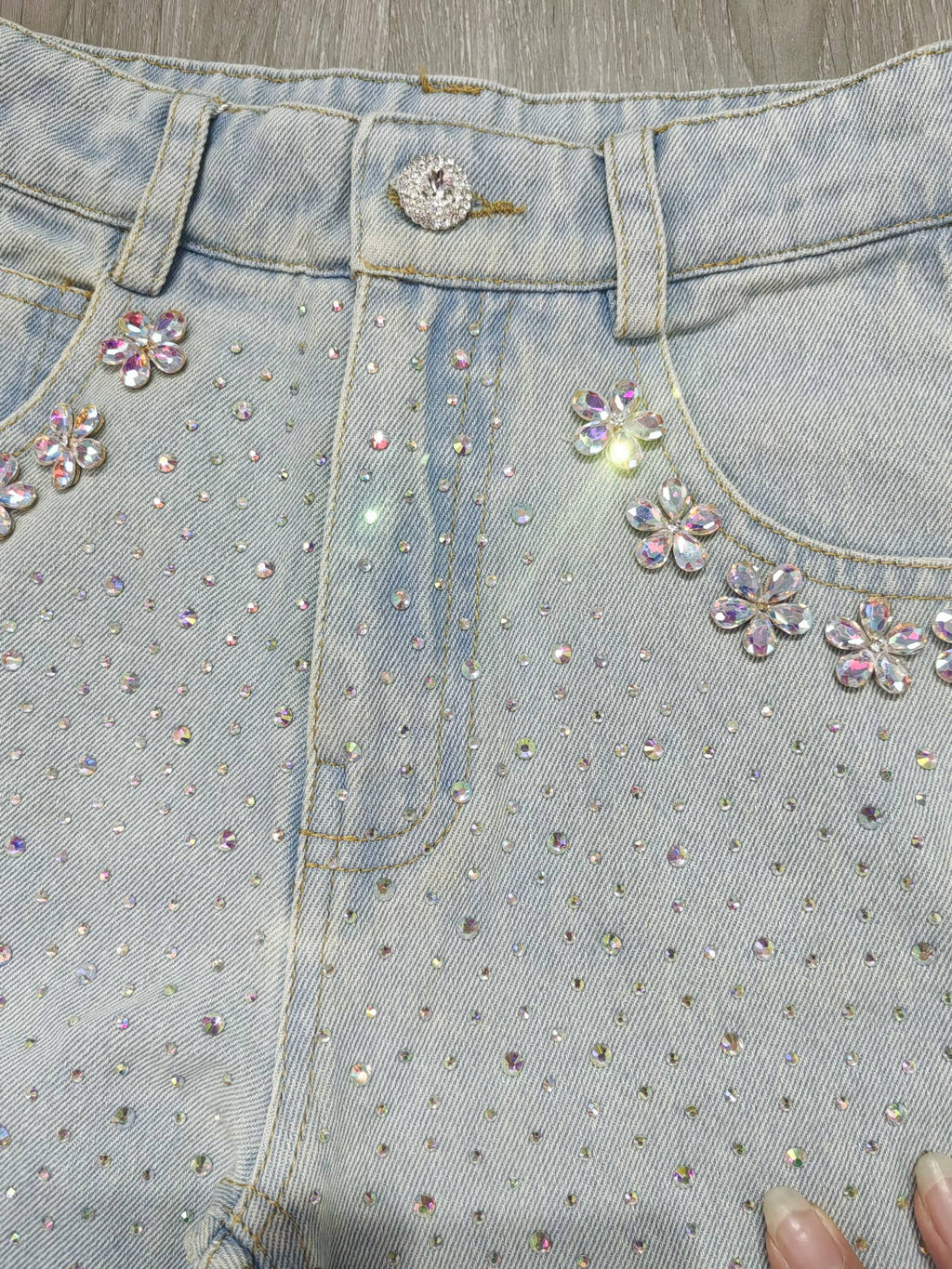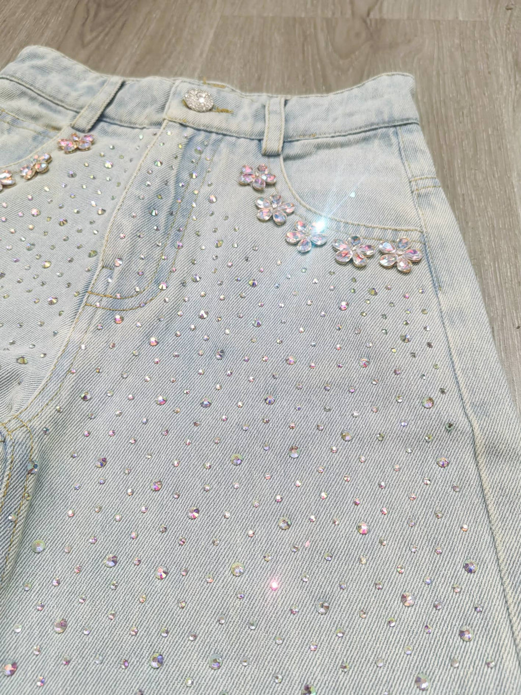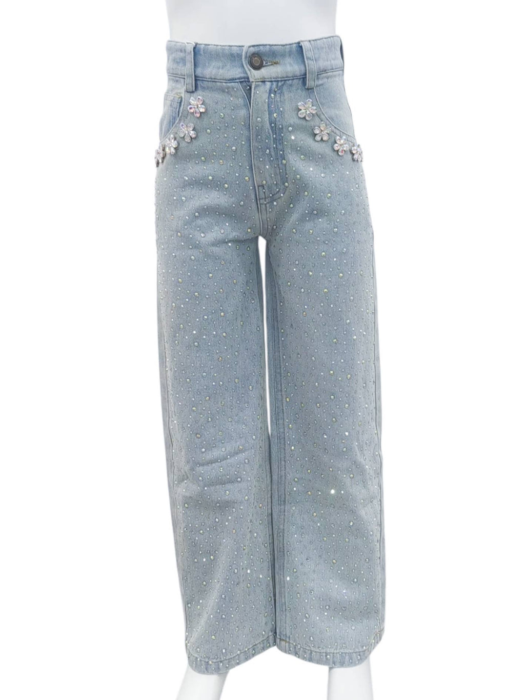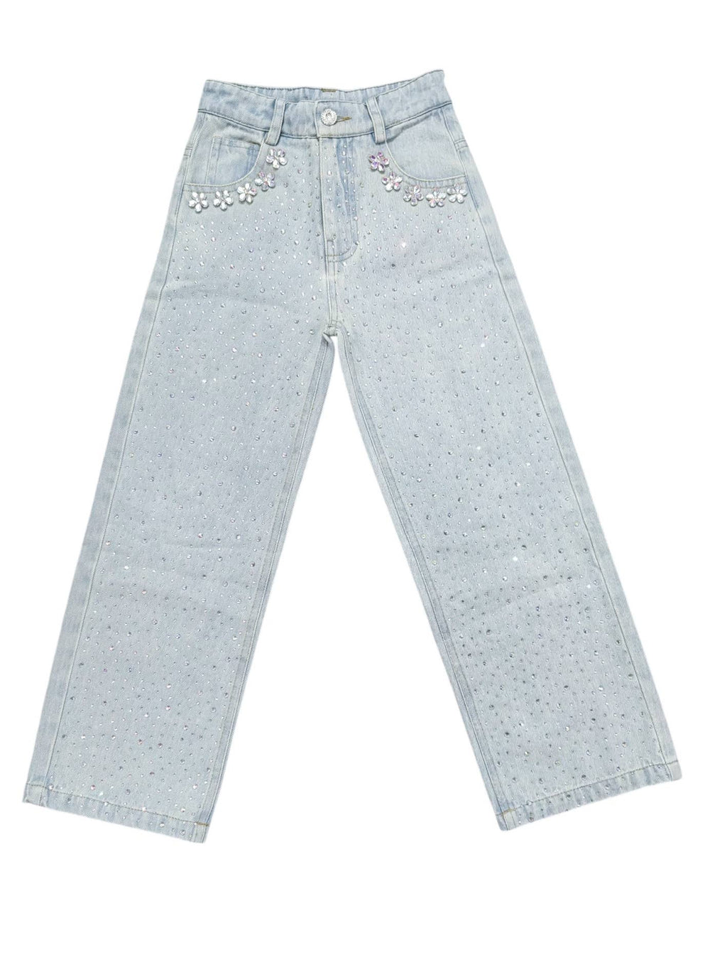 Make a statement with our Gem Wide Leg Denim Jeans, featuring eye-catching gem stamping all over for a dazzling effect. These standout jeans are complemented by flower gems along the pockets, adding a touch of charm to your look. The wide leg design offers a trendy silhouette while ensuring comfort and easy movement.