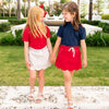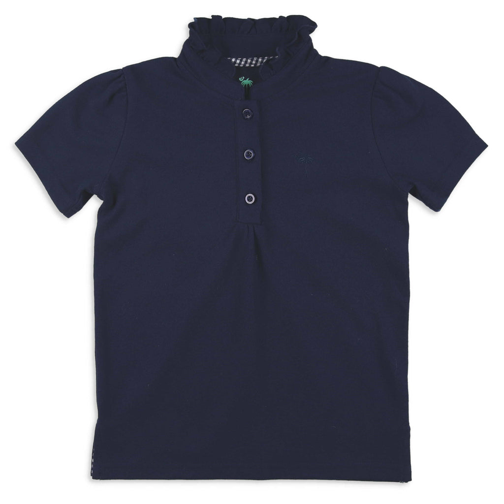 Ruffles return! Introducing our new pique ruffle collar polo tops and dresses for her back to school wardrobe! Who wouldn't fall in love with this sweet Girls Polo-Navy Pique and make it her favorite? This versatile top features soft, poly/cotton blend fabric in navy blue, a ruffle neck, a palmetto tree and shrimp moon front logo, and three custom front buttons making it perfect for pairing with shorts, skorts, skirts, or pants. Such a versatile and comfy top. This polo coordinates with many of our collections and is the ideal top to mix and match with her wardrobe. Perfect for all fun activities, and for cooling off in the late hot summer and warm fall weather! Look for our Boys Performance Polo - Navy for those matching sibling outfits!
