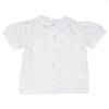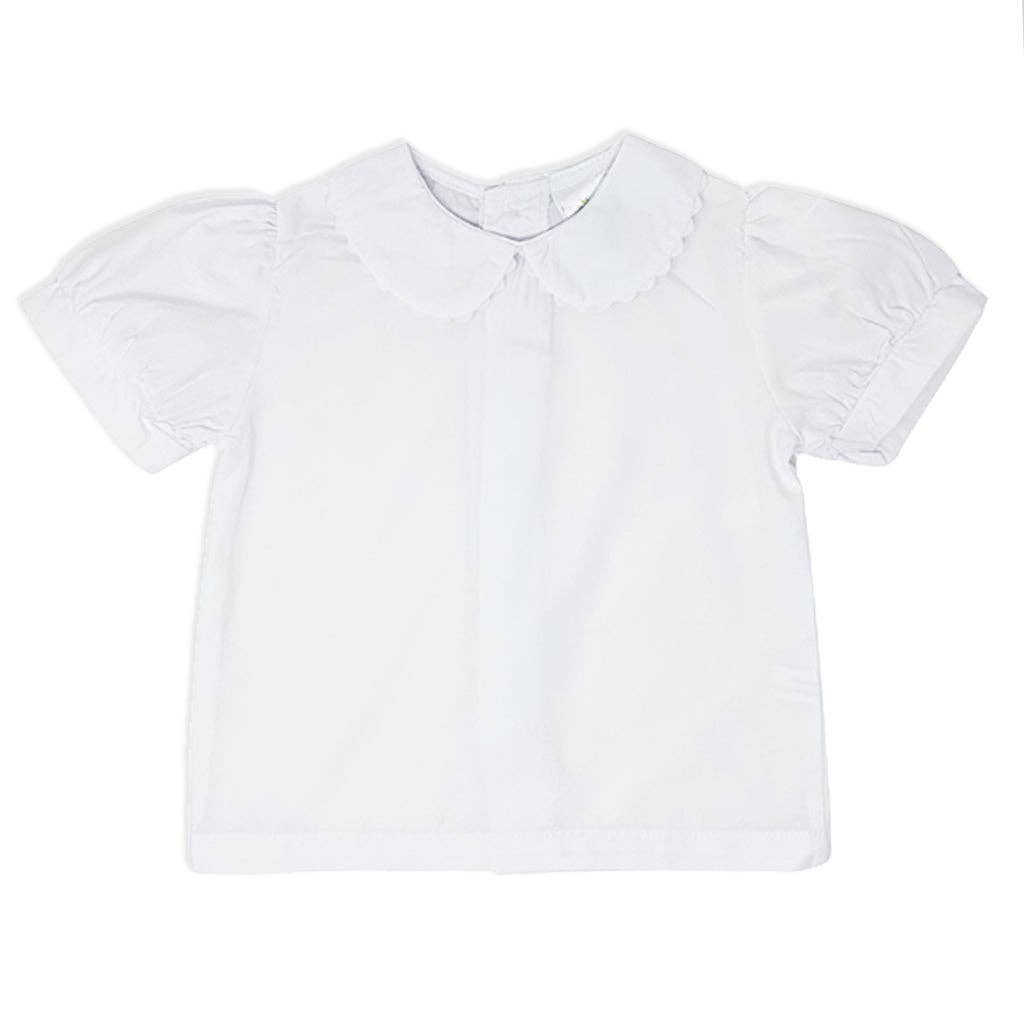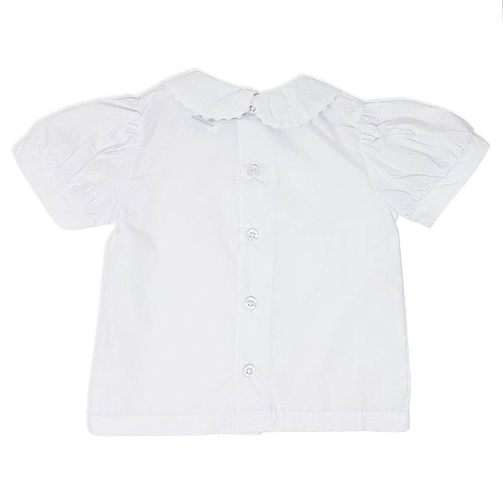 * White ric rac around the collar and cuff for a feminine touch * Buttons in the back make dressing a breeze * Poly /Cotton for fewer wrinkles * Machine wash and tumble dry