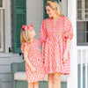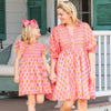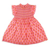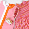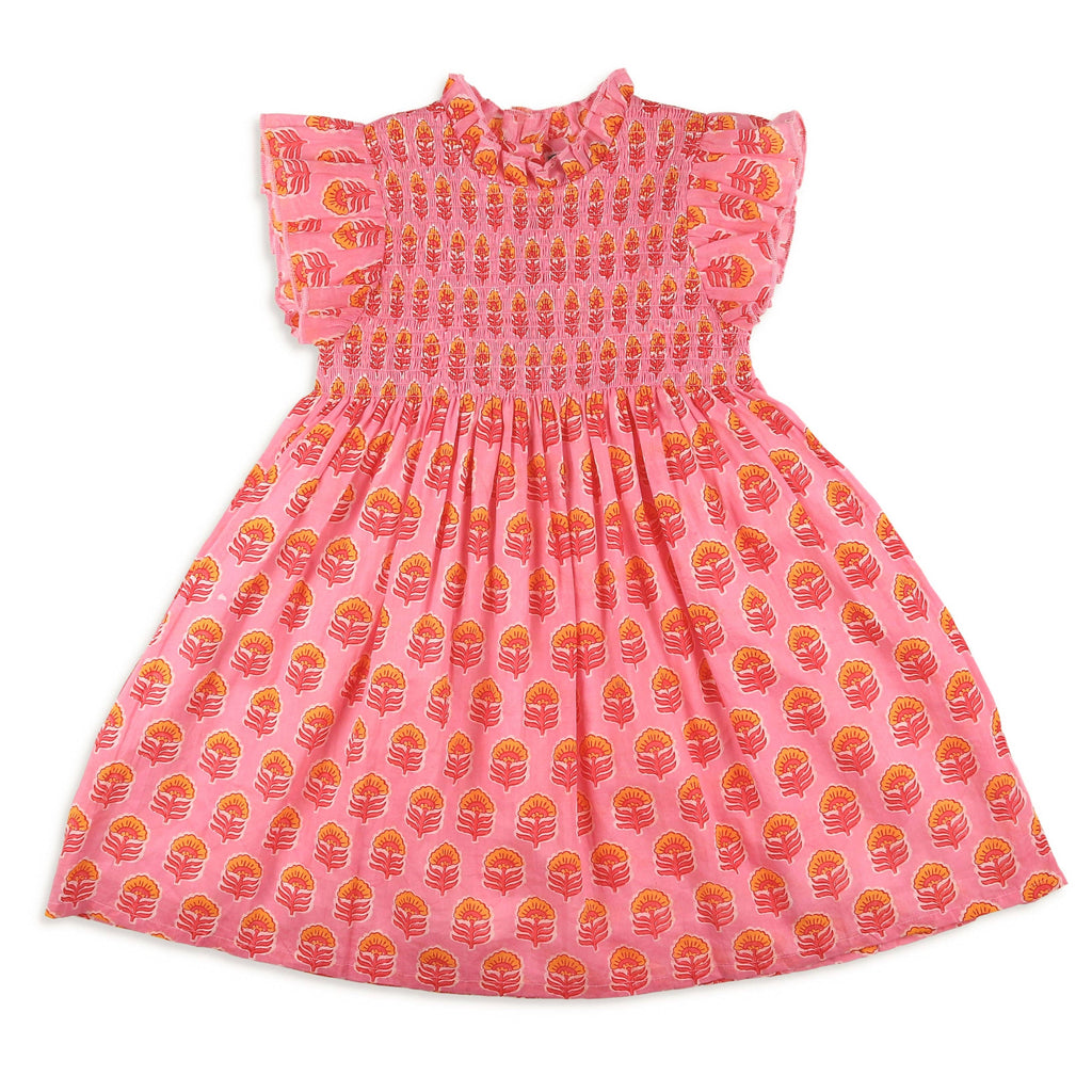 This comfortable and effortless sweet dress features serge trimmed ruffle sleeves and ruffle collar, a smocked top, and a full skirt on a Jaipur inspired orange floral hand printed block print, crafted in India, on soft pink cotton fabric. So carefree and comfy!