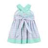 Wide aqua straps crisscross in the back for a secure and stylish fit, while coordinating aqua trim and pink rickrack detail along the hem add the perfect finishing touches. Light, breezy, and full of whimsy, it’s the perfect outfit for summer outings, beach days, or any sunny adventure.