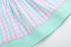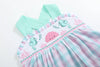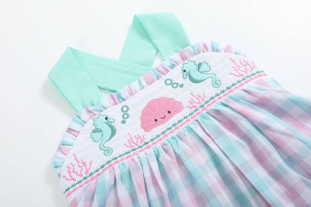 Make a splash in our Pink and Aqua Seashell Smocked Sundress! This adorable dress features a soft pastel gingham in shades of pink, aqua, and lavender, with charming smocking across the chest adorned with embroidered seahorses, coral, and a sweet smiling seashell.