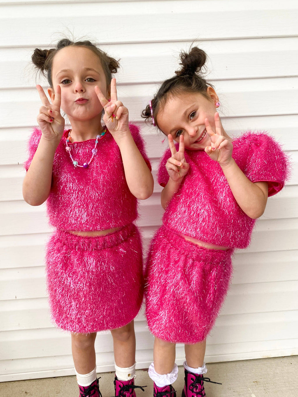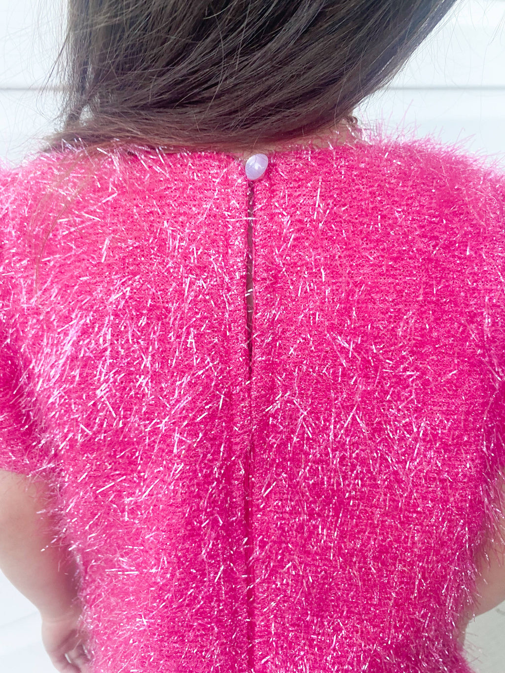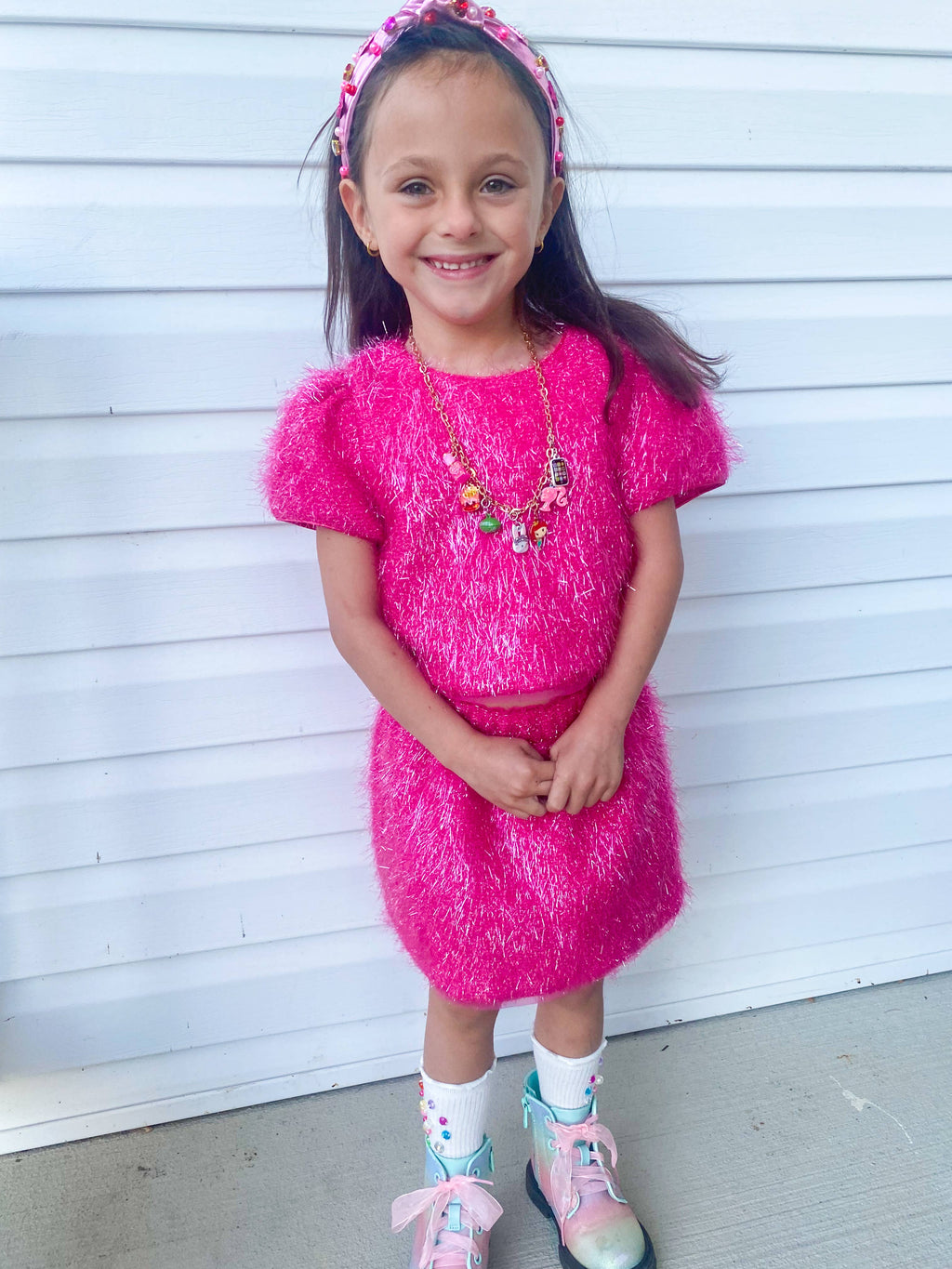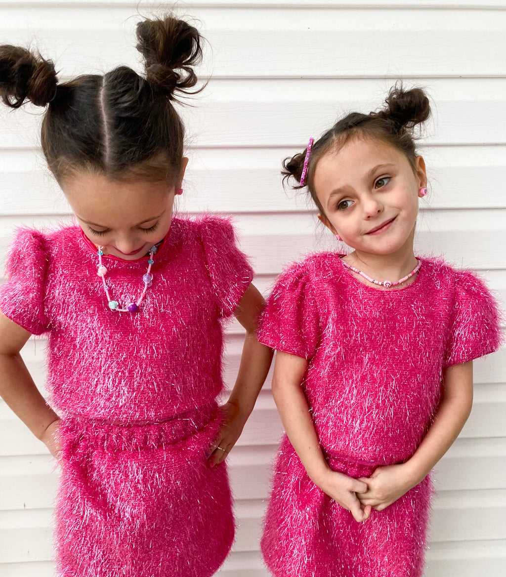 Unleash your inner sparkle with our stunning Girls Sparkle Tinsel Two-Piece Set! This enchanting outfit features a chic satin lining, while the top features a zipper on the lower back and a convenient hook clasp to effortlessly pull over your head. The playful puff sleeves add a whimsical flair, and the skirt’s elastic waistband ensures a comfortable fit for all-day fun.