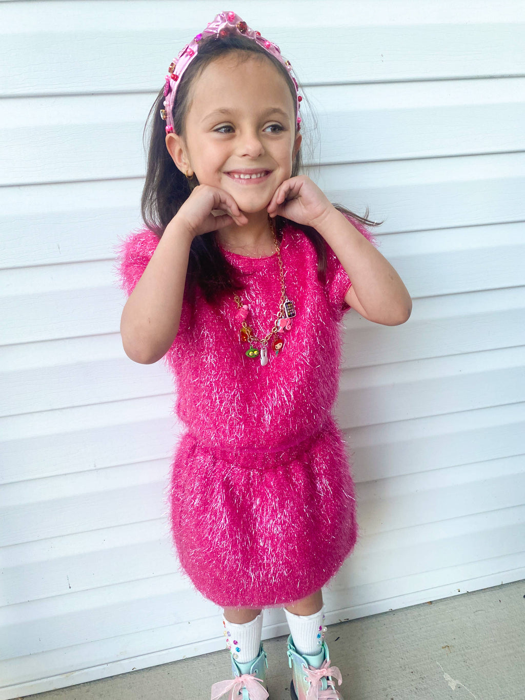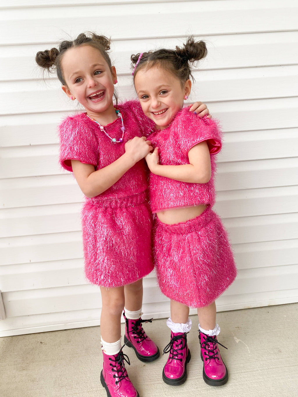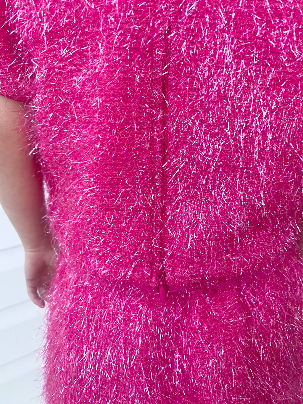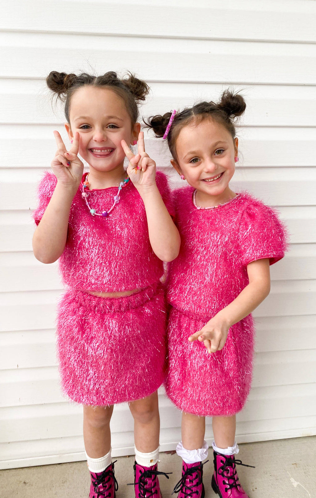 Unleash your inner sparkle with our stunning Girls Sparkle Tinsel Two-Piece Set! This enchanting outfit features a chic satin lining, while the top features a zipper on the lower back and a convenient hook clasp to effortlessly pull over your head. The playful puff sleeves add a whimsical flair, and the skirt’s elastic waistband ensures a comfortable fit for all-day fun.