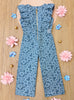 * Chambray denim SmileyWorld®icon flower print, ruffle shoulder accents, front zipper, SmileyWorld® embroidery, belt loops at the waist, side and back pockets