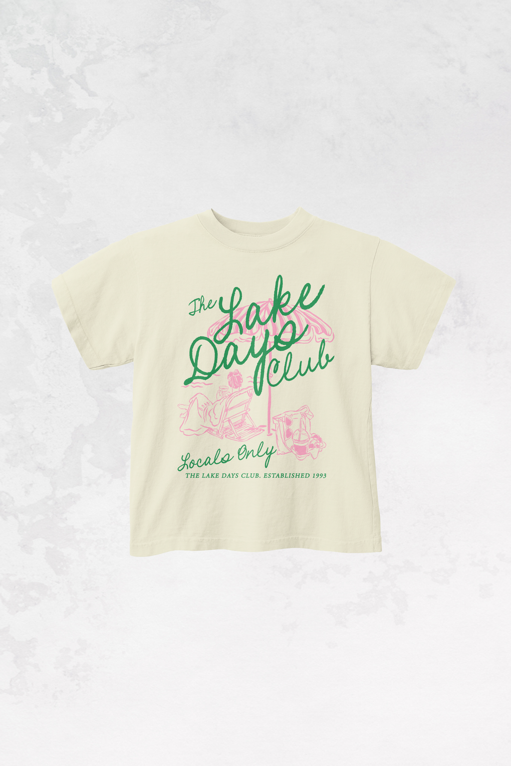 - Features "The Lake Days Club" with "Locals Only - The Lake Days Club. Established 1993" to the side/bottom of a girl by the lake in pink and green ink