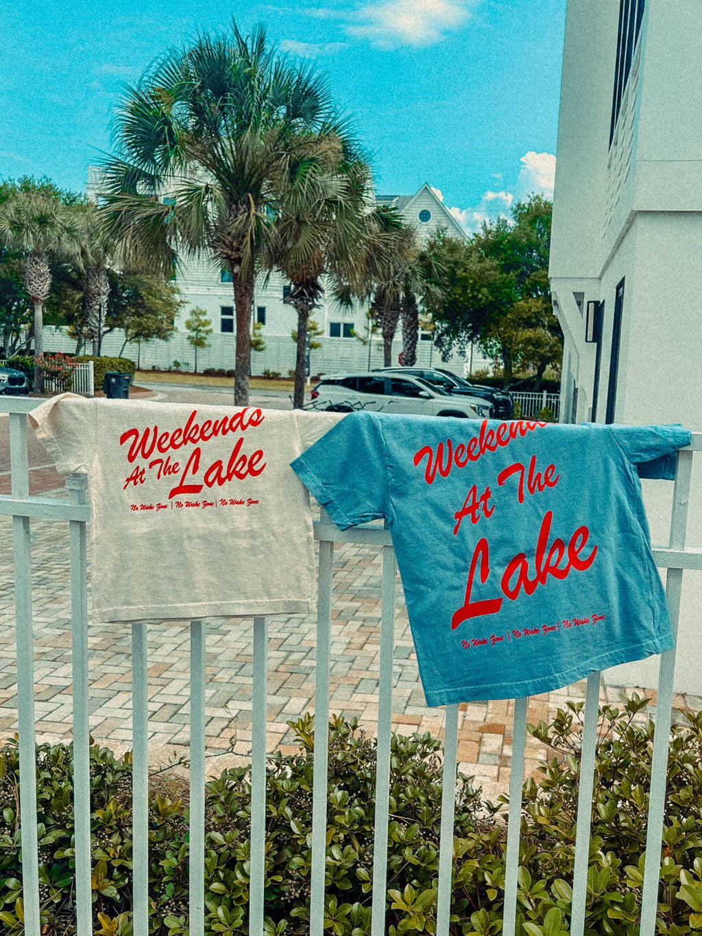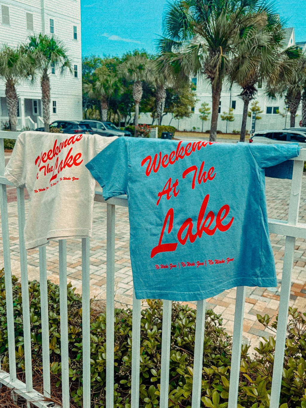 - Features "Weekends at the Lake - No Wake Zone" across the front and back in a red ink
