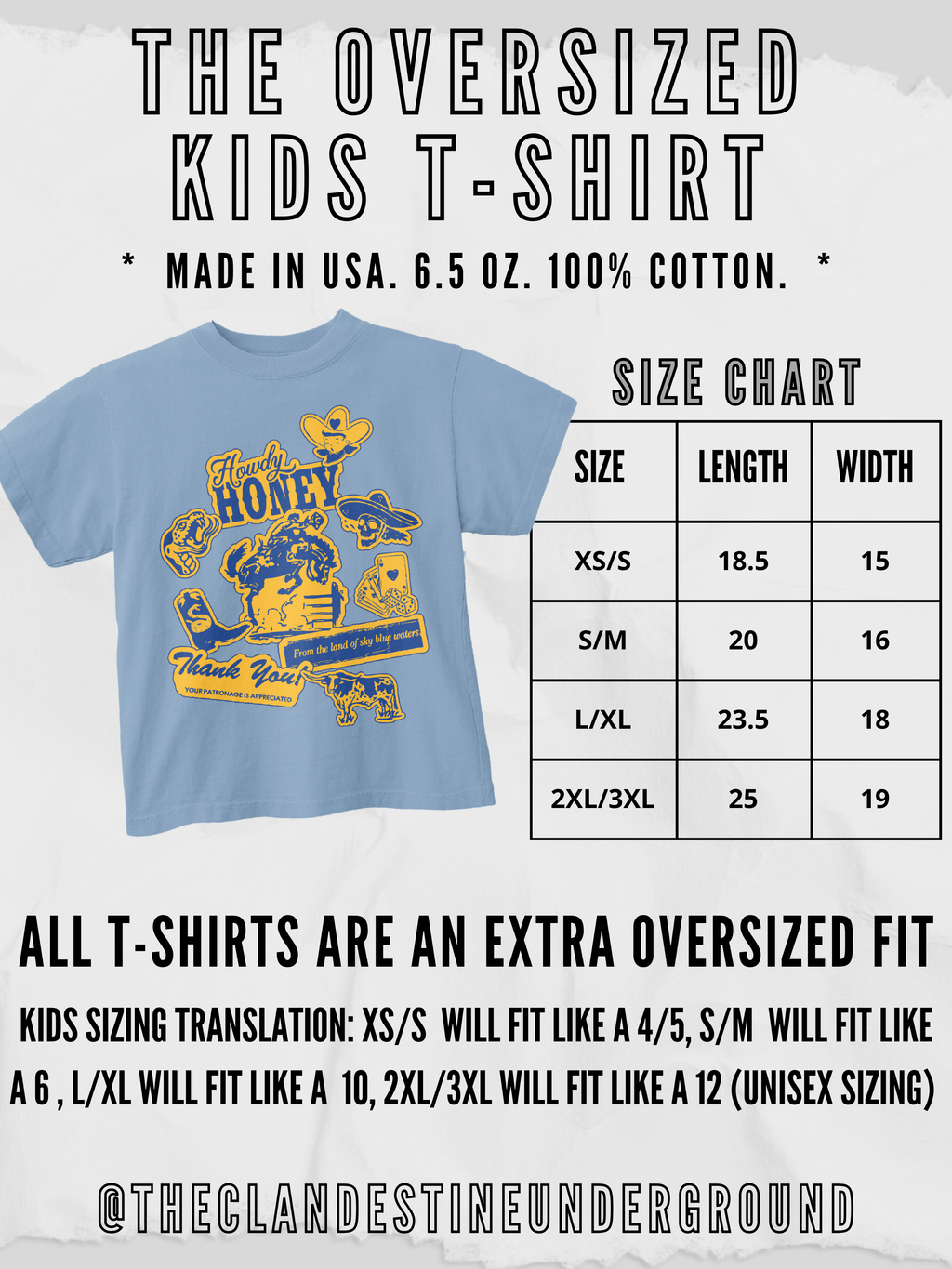 - Refer to photos for size references on how the tees fit -- Model in Green is typically a size 2T wearing a size 4/5 for an oversized look | Model in Black is typically a size 5T wearing a size 6 for an oversized look