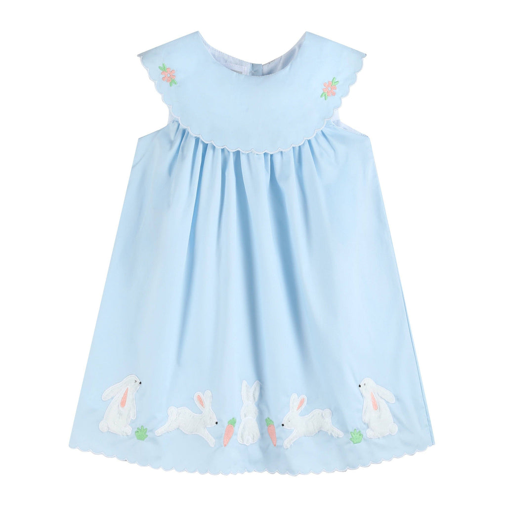 This darling Light Blue Bunny and Flowers Dress is full of springtime charm! It features a pretty scalloped collar adorned with delicate flower embroidery, adding an extra touch of sweetness. Along the bottom, are adorable fuzzy bunnies which brings the perfect amount of playful detail. Ideal for Easter, garden parties, or sunny day outings—this dress is as precious as it is picture-perfect!