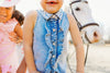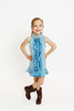 This sleeveless ruffle denim dress is made from soft, stretchy denim with sparkly button details, a rhinestone collar, and a flouncy hem—perfect for twirls, rodeos, or everyday sass.