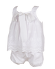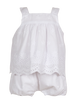 The sweetest summer eyelet collection captures the essence of dreamy sunny summer days. Sleeveless top with gathered pleats under yoke for fullness. X Ribbon closure in back creating the softest sash bow. Fully lined top and diaper cover in matching eyelet fabric. Polyester cotton blend eyelet fabric for wash and wearability.