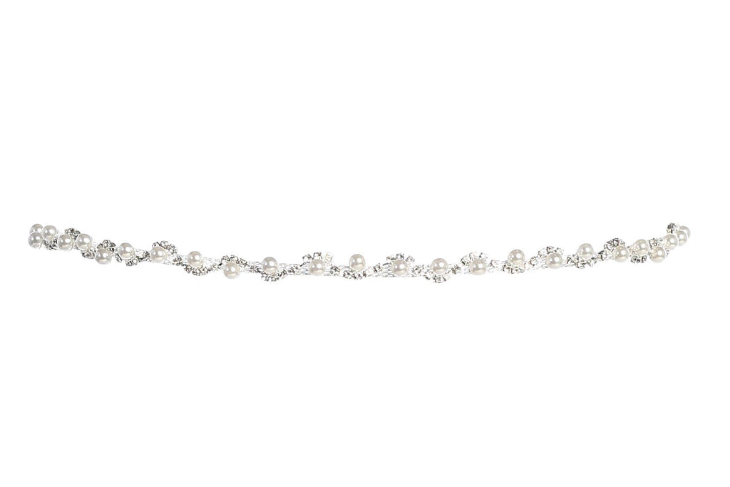 Simple satin bodice with a tulle skirt. The waist is accented with a cute wavy rhinestone and pearl trim.
