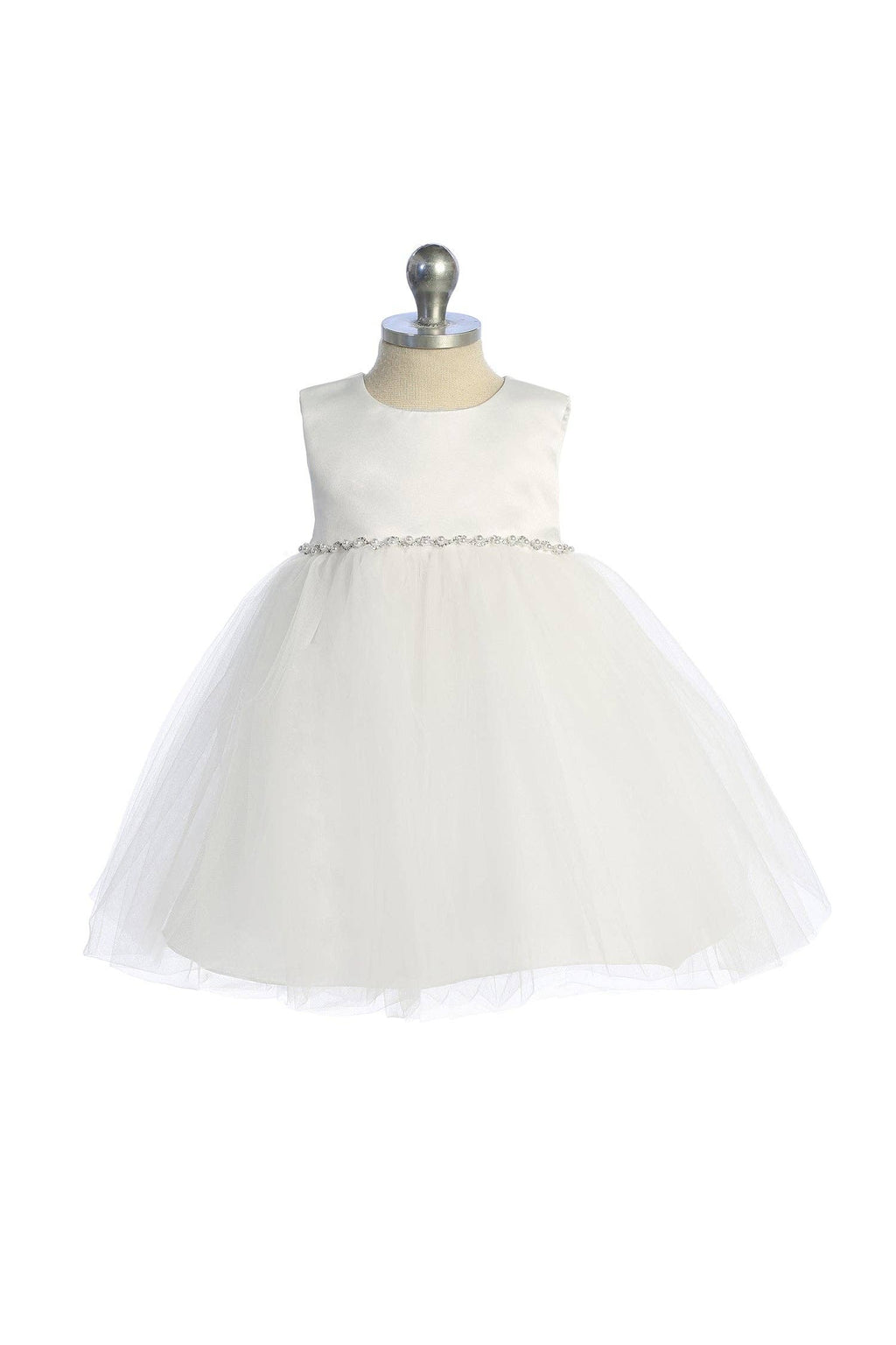 Satin Top Baby Dress with Wavy Rhinestone & Pearl Trim