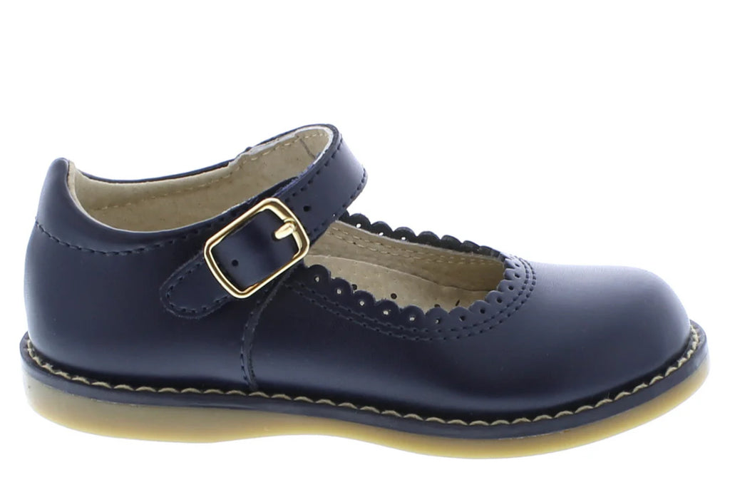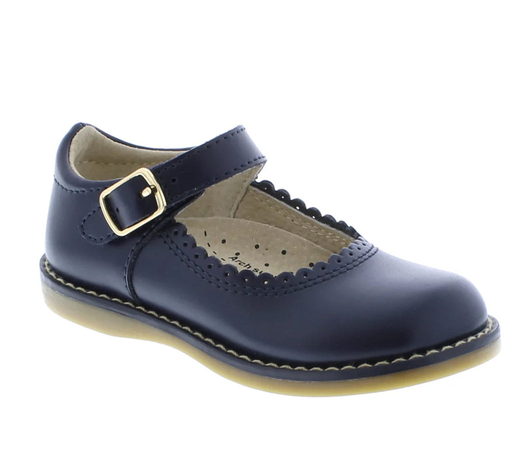 CLASSIC LEATHER MARY JANE FEATURING HOOK-AND-LOOP ANKLE STRAP WITH DECORATIVE BUCKLE AND SCALLOP/PERF THROAT DESIGN. OFFERED IN MATTE AND METALLIC COLORS; SIZES RANGING FROM 3.0 INFANT - 1.0 YOUTH.