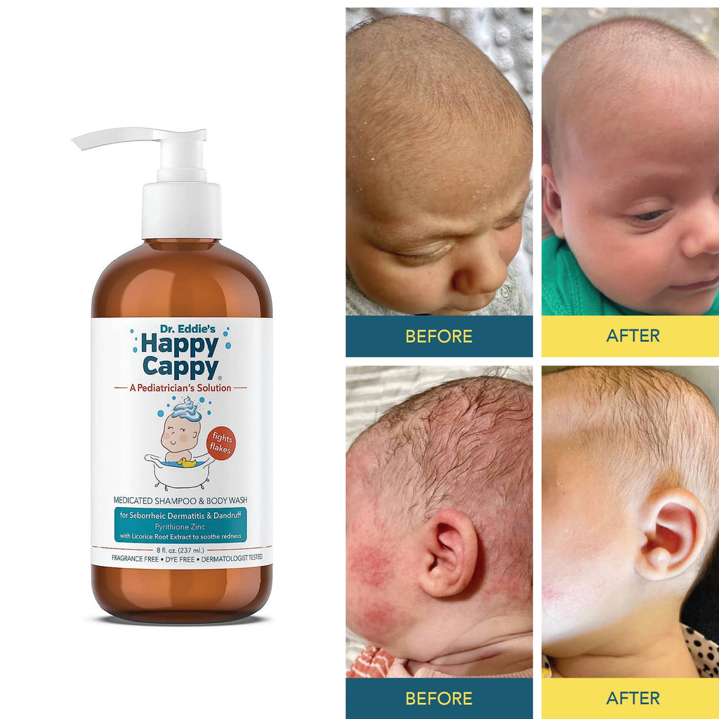 Happy Cappy is the first OTC (Over The Counter) shampoo and body wash made specifically for children of all ages with active ingredient, Pyrithione Zinc, which has been proven safe and effective for many decades for relief of dandruff and seborrheic dermatitis. It also contains the natural ingredient Licorice Root Extract to help soothe redness behind ears, under armpits, and in neck folds.