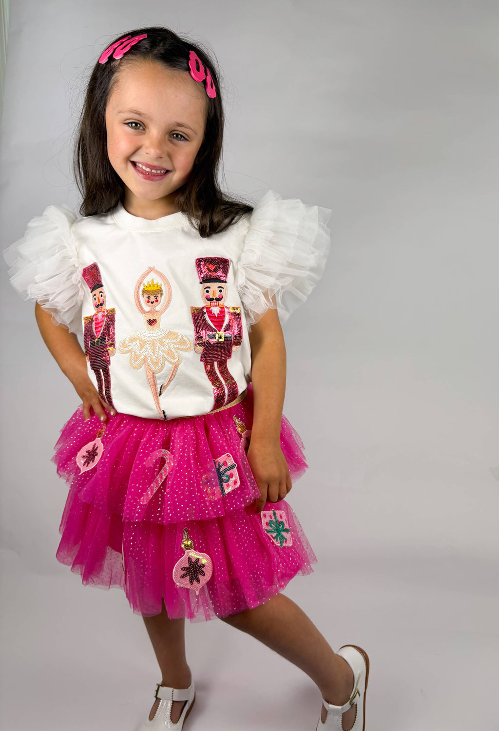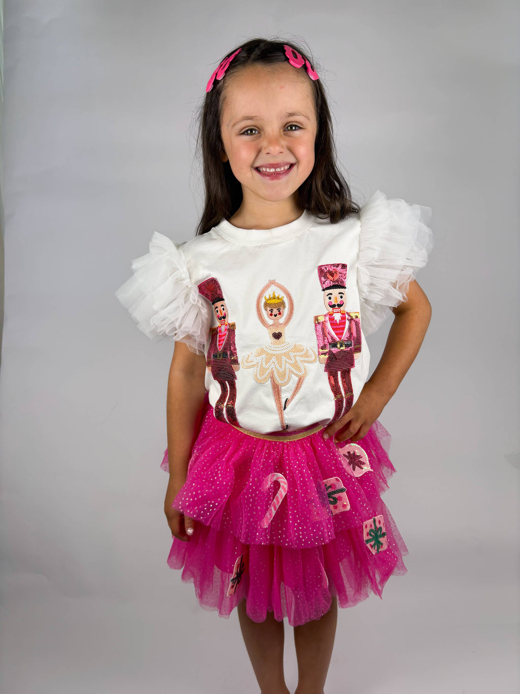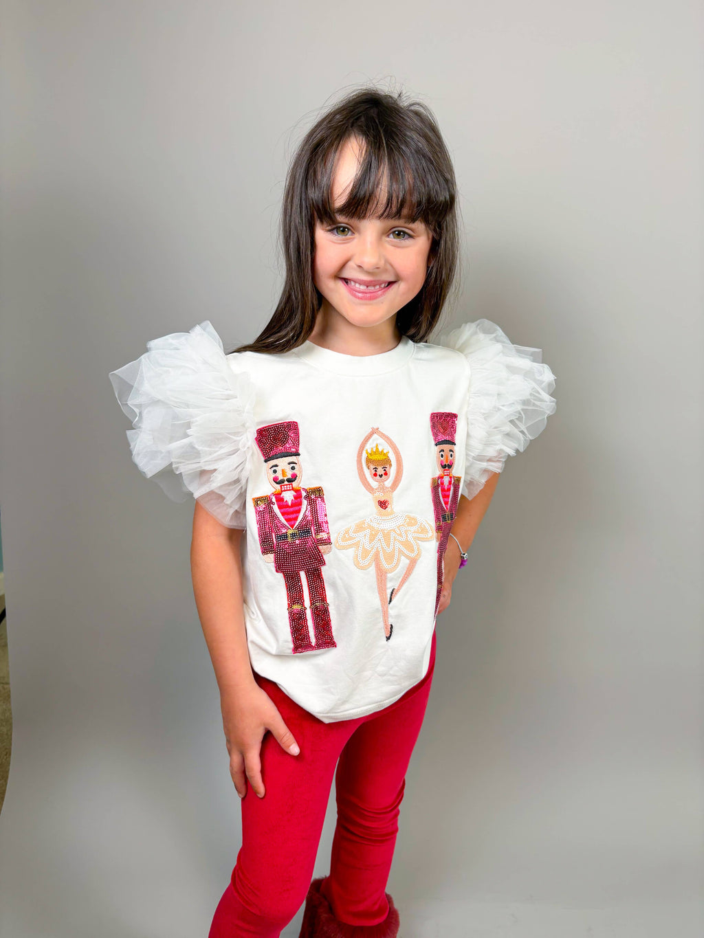 Introducing our Patched Nutcracker and Ballerina Top with Tulle Sleeves—a uniquely stylish piece that combines playful charm with a touch of sophistication. Crafted from soft, breathable fabric, this top features an eye-catching nutcracker and ballerina patches that adds a whimsical flair.