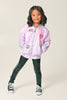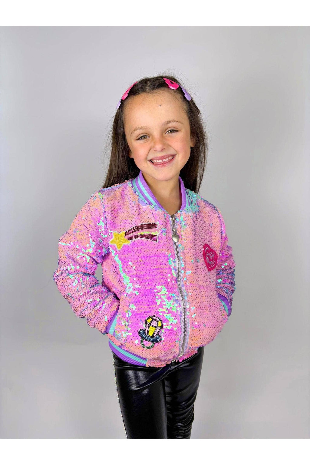 Elevate your style with our stunning purple sequin bomber jacket, lined with luxurious velour for an extra touch of comfort. This eye-catching jacket features a whimsical large smile daisy patch on the back, complemented by an assortment of fun, embroidered patches adorning the front. Each design is expertly sewn on for durability and flair. The finishing touch? A delightful flower charm zipper that adds a playful accent to this statement piece.