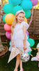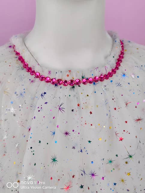 This dreamy sparkle white cake dress will surely make heads turn at your birthday party or next special event. This cake dress has four layers of white tulle with metallic sparklers printed on it in rainbow foil. There are magenta gems sewn along the neckline of the dress. It is lined with a cotton slip. Dresses are true to size and come right to the knee! We recommend to order the size you normally wear. Washing machine in cold delicate and air dry.